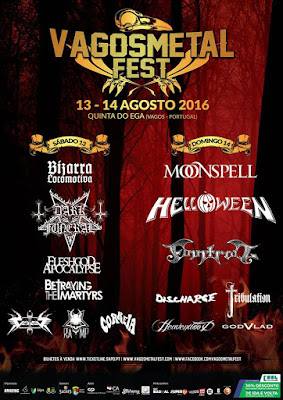 [ING] Vagos Metal Fest first edition couldn't have run better. With a kick start by Correia and their psychadelic rock, followed by French metalcore band Betraying The Marty opening ways for North Americans thrashers Vektor. Before Sun set time for R.A.M.P. to give a fabulous concert and with the first moonbeams came Italians Fleshgod Apocalypse before Swedish Dark Funeral penumbra. Closing, all aboard Bizarra Locomotiva in a trip to the recesses of the soul. See photos here. \m/